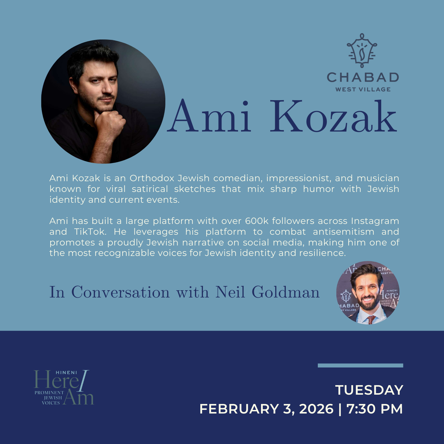 Hineni is a forum that brings together thought leaders and prominent Jewish voices to explore the big questions at the heart of Judaism, Israel, and the contemporary Jewish world. Inspired by the profound meaning of Hineni (Here I am)—a call to presence, purpose, and responsibility—this ongoing series invites you into critical conversations that shape who we are and where we’re headed. From the challenges of modern Israel to the beauty of timeless Jewish values, Hineni offers a platform for thought-provoking dialogue, authentic connections, and inspiring ideas—all with the signature warmth and charm of Chabad West Village that you know and love.