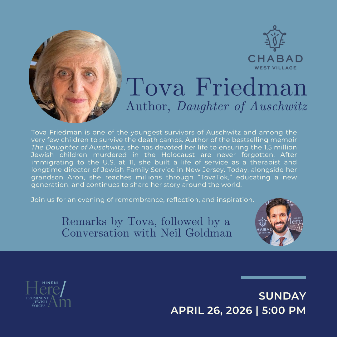 Introducing Hineni: Here I Am—a forum that brings together thought leaders and prominent Jewish voices to explore the big questions at the heart of Judaism, Israel, and the contemporary Jewish world. Hineni, inspired by a phrase echoing our ancestors' readiness to show up, invites you to join critical conversations that shape who we are and where we’re headed. Moderated by Neil Goldman, Hineni: Here I Am offers a platform for thought-provoking dialogue, authentic connections, and inspiring ideas—all with the signature warmth and charm of Chabad West Village that you know and love.